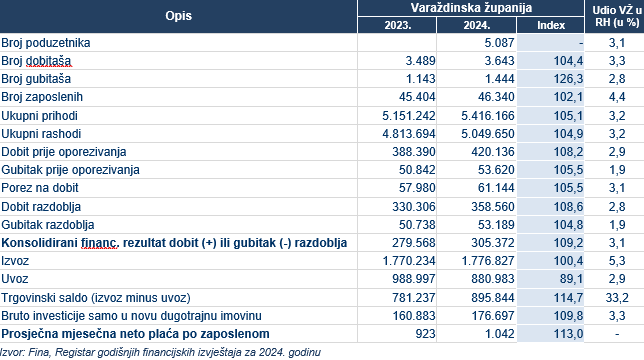 U Varaždinskoj županiji u 2024. godini, prema broju obrađenih godišnjih financijskih izvještaja, sjedište je imalo 5.087 poduzetnika, kod kojih je bilo 46.6340 zaposlenih, što je u odnosu na prethodnu godinu povećanje broja zaposlenih za 2,1%. Poduzetnici županije ostvarili su, u 2024. godini, ukupne prihode u iznosu od 5,4 milijarde eura (5,1% više u odnosu na 2023. godinu), ukupne rashode od 5,0 milijardi eura (4,9% više) te iskazali neto dobit u iznosu od 305,4 milijuna eura (9,2% više u odnosu na 2023. godinu).