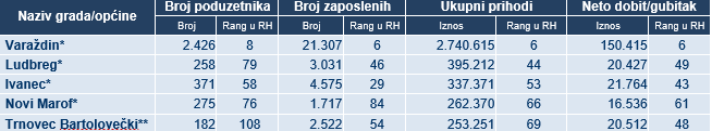 Na rang listi gradova i općina Varaždinske županije, poduzetnici Varaždina najbrojniji su (2.426) te prvi po broju zaposlenih (21.307), ukupnim prihodima (2,7 milijardi eura) i neto dobiti (150,4 milijuna eura). Po kriteriju ukupnih prihoda, slijede poduzetnici s područja grada Ludbrega, gdje predvodi tvrtka Bomark Pak, pa Ivanca te Novog Marofa gdje je najistaknutija tvrtka Knauf Insulation. Peti su poduzetnici unutar poslovne zone Općine Trnovec Bartolovečki gdje je najistaknutija tvrtka Boxmark Leather.