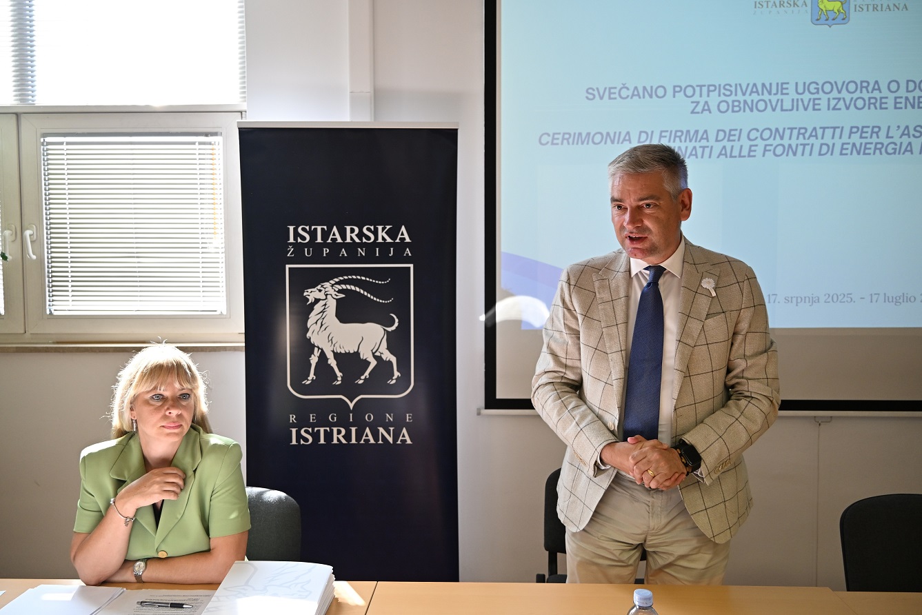 Istarski župan Boris Miletić potpisao je ugovore s ukupno 60 građana s područja Istarske županije, temeljem Javnog poziva za sufinanciranje korištenja obnovljivih izvora energije (OIE) i energetske učinkovitosti u obiteljskim kućama, čime je osigurano 300 tisuća eura za projekte izrade energetskih certifikata, ugradnje sunčanih elektrana i infrastrukture za punjenje električnih vozila, kao i dodatnih 100.000 eura koje je usmjereno na prerađivačku industriju, gdje se podupire izgradnja solarnih sustava u proizvodnim pogonima.