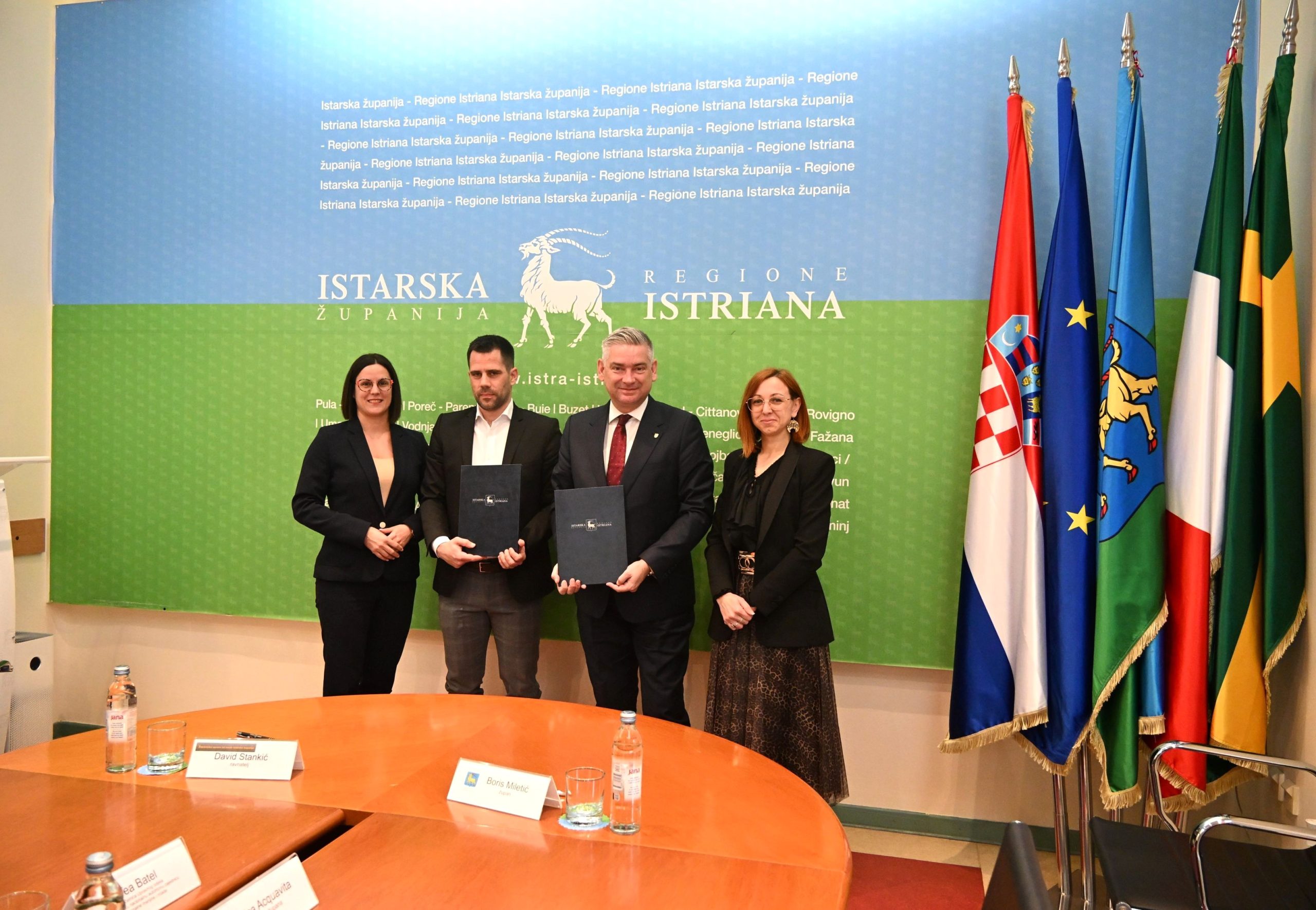 Istarski župan Boris Miletić danas je u sjedištu Istarske županije u Puli s ravnateljem Županijske uprave za ceste Istarske županije Davidom Stankićem, potpisao Ugovor o namjenskom utrošku sredstava za dvojezičnu prometnu signalizaciju. Svečanom potpisivanju prisustvovale su i zamjenica župana Jessica Acquavita te pročelnica Upravnog odjela za talijansku nacionalnu autohtonu zajednicu, nacionalne manjine i mlade Tea Batel.