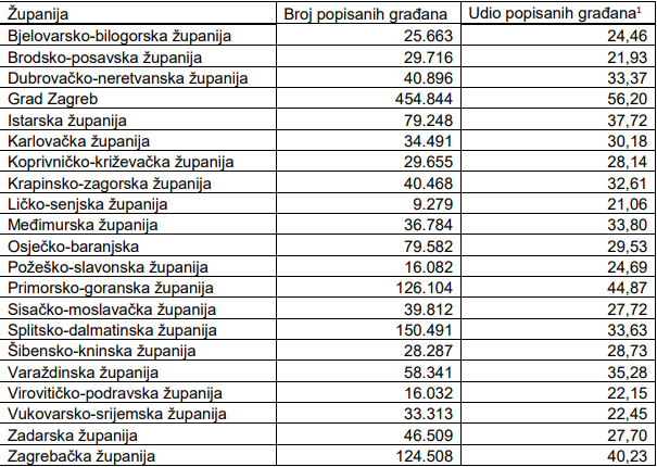Nakon Grada Zagreba, gdje se je samopopisalo 56,20 posto građana, slijedi Primorsko-goranska županija sa samopopisanih 44,87 posto građana, Zagrebačka županija 40,23 posto, Istarska 37,72 posto građana, Varaždinska 35,28 posto građana te Međimurska gdje se je samopopisalo 33,80 posto građana.