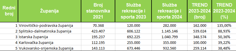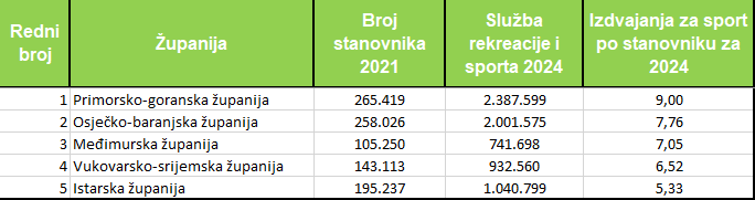 Najviše je iz proračuna za sport u 2024. godini, usporedi li se iznos s brojem stanovnika, izdvojila Primorsko-goranska županija (9 eura), Osječko-baranjska županija blizu 8 eura, Međimurska 7 eura, Vukovarsko-srijemska 6,5 eura i Istarska županija 5 eura. Prve tri vodeće su i u poretku županija s najvećim udjelom izdvojenih sredstava za sport u 2024. godini – Primorsko-goranska s 0,89 posto, Osječko-baranjska s 0,80 posto i Međimurska s 0,77 posto. Slijedi Zagrebačka županija s izdvojenih 0,66 posto i Vukovarsko-srijemska s 0,63 posto. U apsolutnom iznosu, najviše je proračunska sredstva za sport povećala u odnosu na 2023. godinu Splitsko-dalmatinska županija, za 539 tisuća eura, slijedi Primorsko-goranska s rastom od 488,9 tisuća eura, Osječko-baranjska je povećala sredstva za 471,1 tisuću, Istarska za 348,6 tisuća i Zagrebačka županija za 273,5 tisuća eura. U relativnom iznosu, najveći su rast izdvojenih sredstava za sport u proračunu za 2024. godinu u odnosu na 2023. imale: Virovitičko-podravska županija za 135 posto, Splitsko-dalmatinska za 89 posto, Istarska za 50 posto, Karlovačka za 39 posto i Vukovarsko-srijemska za 38,5 posto. (L. K.)